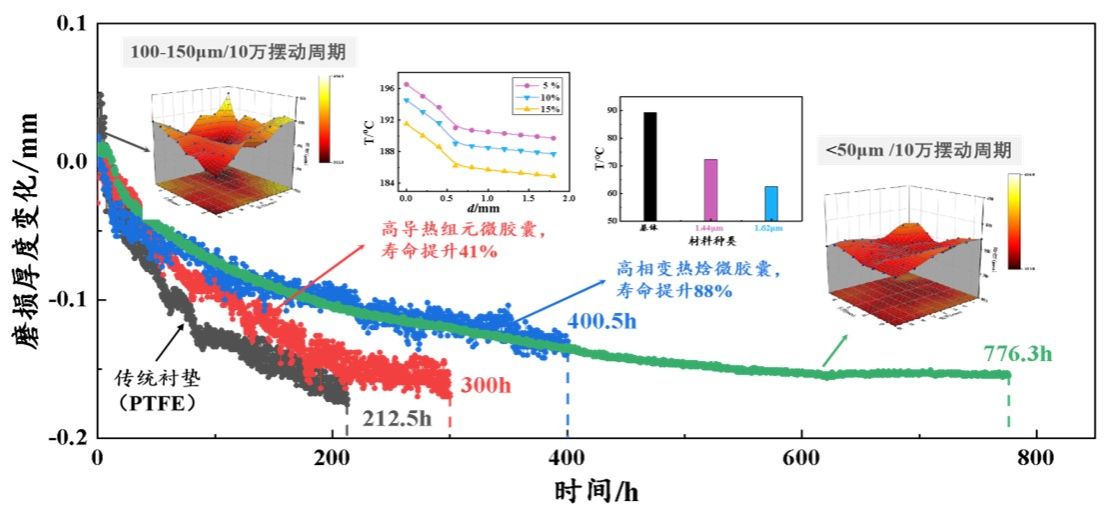 团队基于降低与均匀化摩擦表面温度的技术路线,研究了一种热控微胶囊衬垫复合材料损伤控制方法。高导热微胶囊在摩擦过程中形成了能够快速导热的表面膜,具有表面温度均匀化及显著降低表面温度效果的功能;通过微胶囊分布与摩擦热场的匹配调控,实现了衬垫摩擦表面温度均匀化与低温化,保证了衬垫的均匀低磨损。应用结果表明每10万摆动周期,衬垫局部面磨损不均匀度从100~150μm降低至50μm以下(图2)。相关成果已获授权发明专利11件,发表论文16篇。